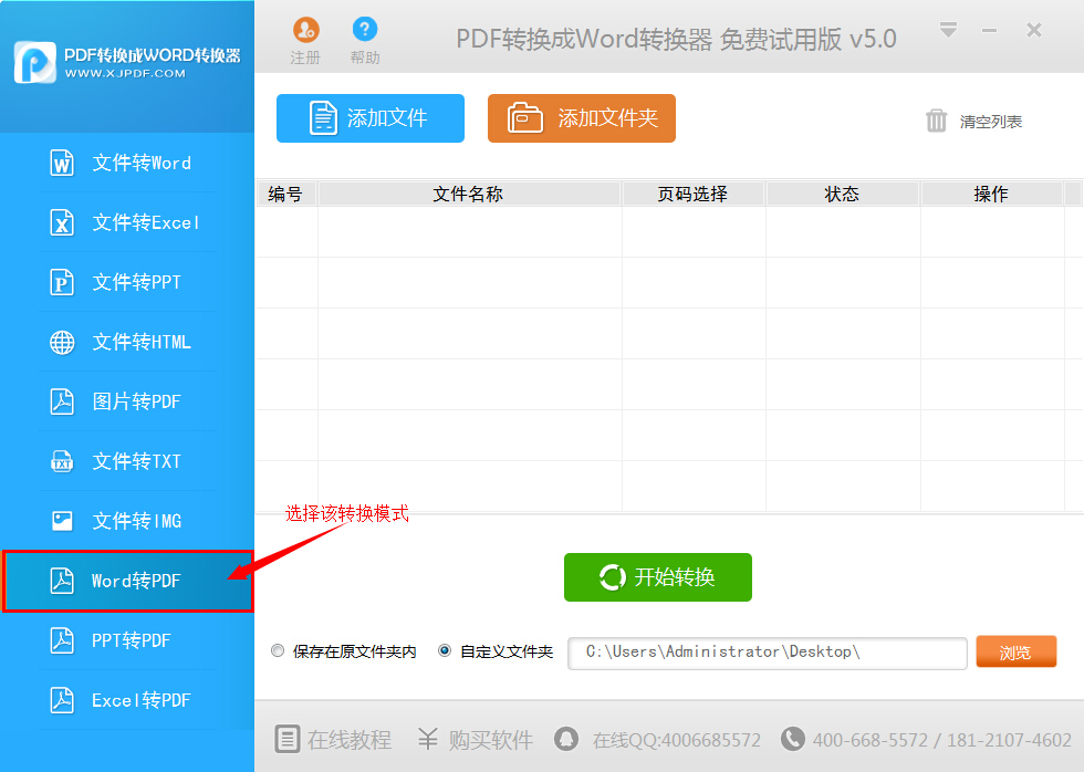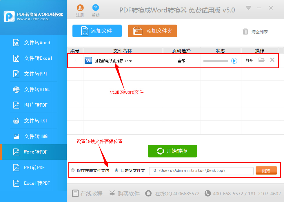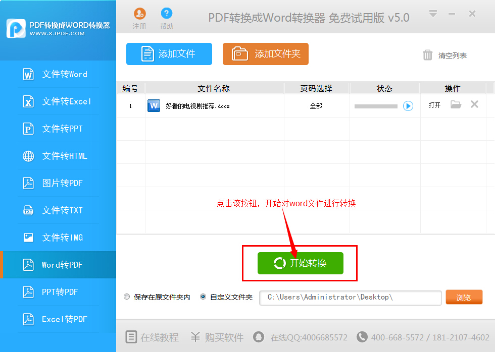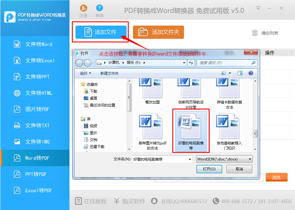 第3步,点击“添加文件”按钮,将需要转换的word文件添加到软件中。大家也可以使用鼠标将word文件拖拽到软件界面中进行文件添加。
